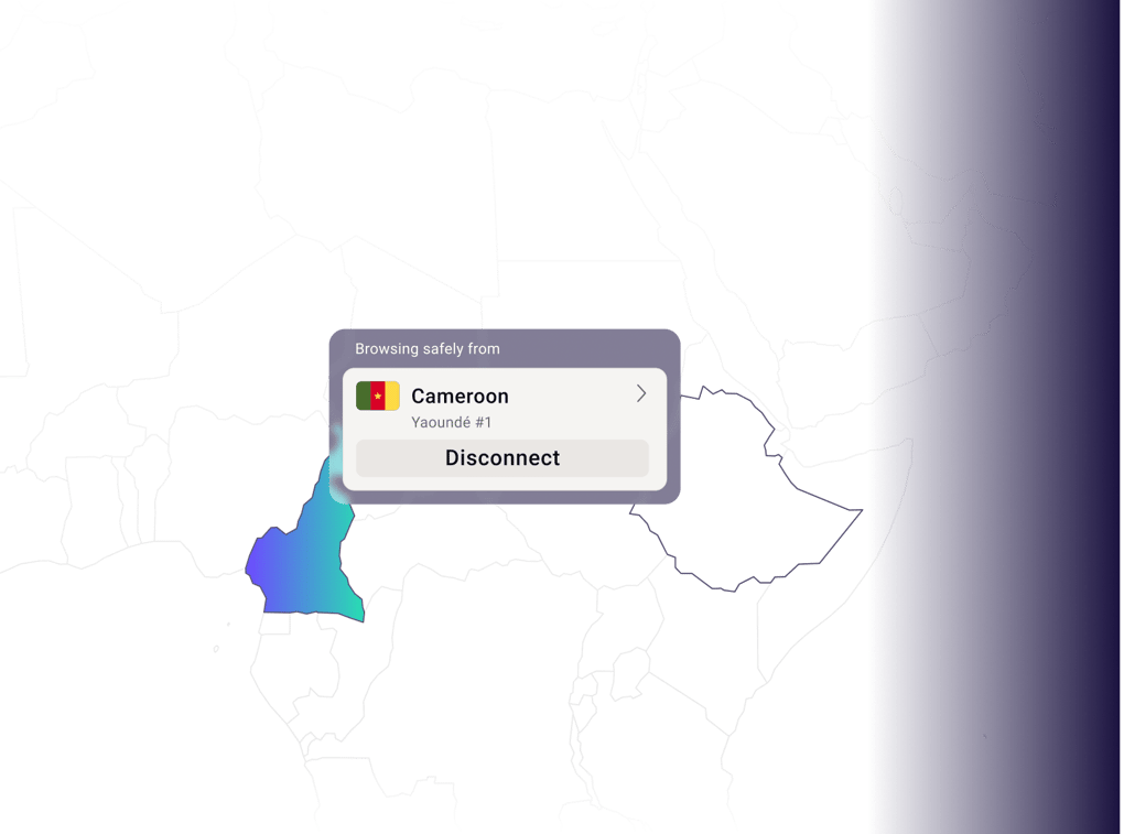 Browse the internet with a Cameroonian IP address no matter where you are in the world by connecting to one of our secure Cameroonian VPN servers. To anyone monitoring the network, your web traffic will appear as though you are in Cameroon.