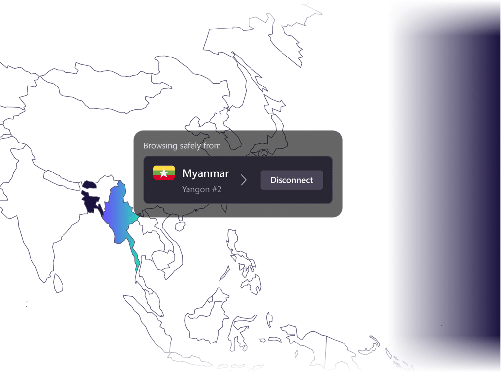 We have servers in Myanmar, allowing you to bypass regional blocks, stream unlimited entertainment, and protect your privacy.